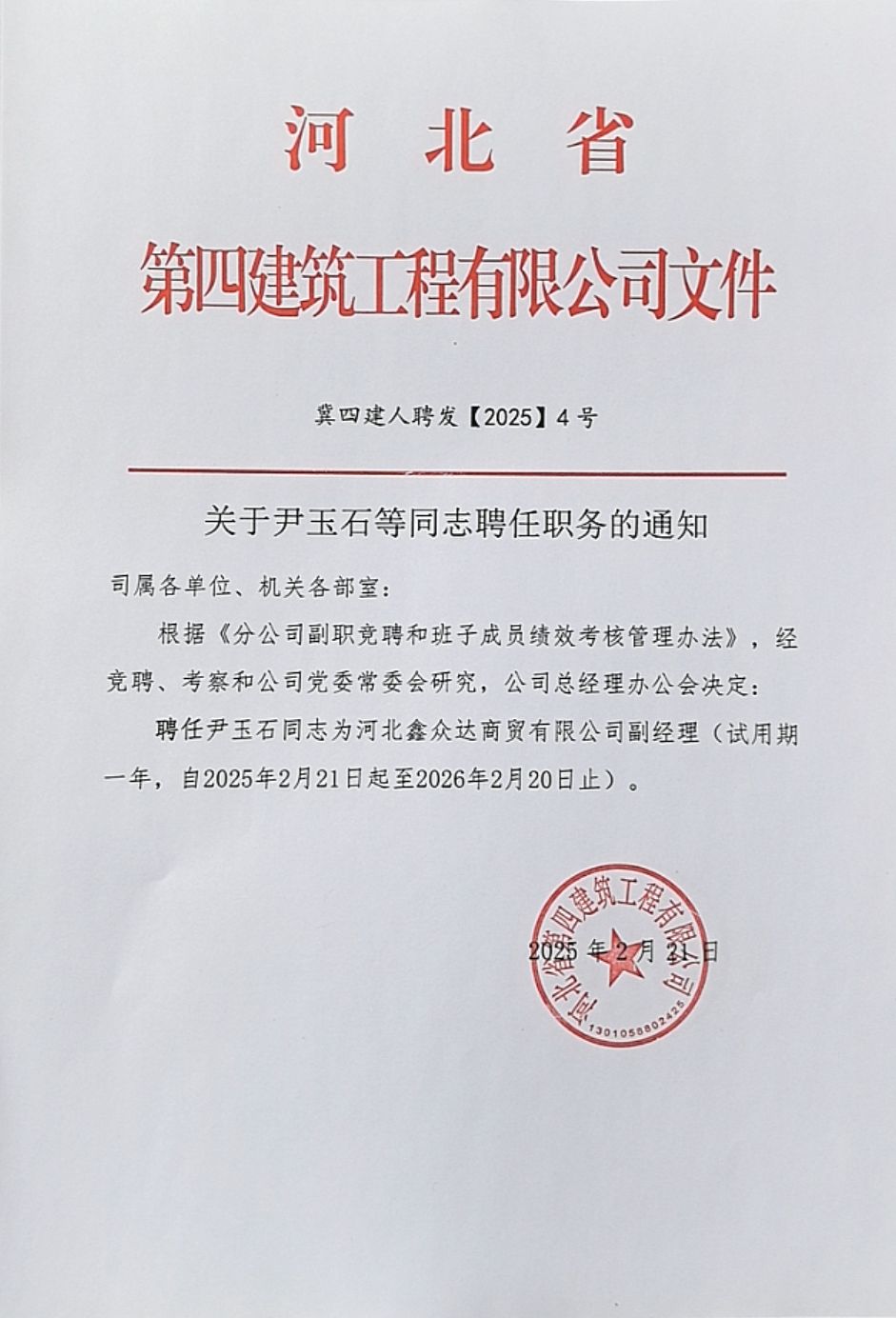河北四建:关于耿洪波同志聘任职务的通知